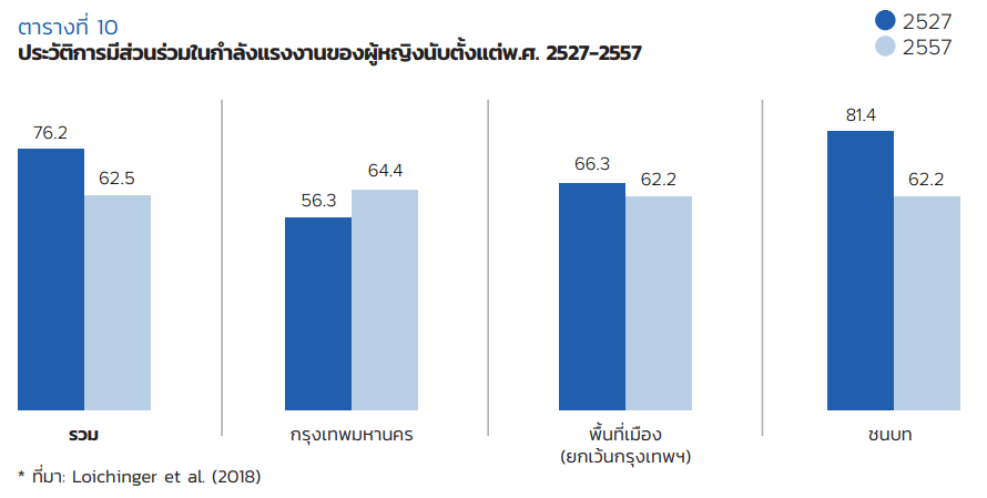 แนวโน้มการเข้าร่วมในตลาดแรงงานของผู้หญิงไทยลดลงนับตั้งแต่วิกฤตเศรษฐกิจปี 1990 โดยอัตราการมีส่วนร่วมของแรงงานทั้งหมดลดจาก 77% ในปี 1984 เหลือ 62% ในปี 2014 ปัจจัยหนึ่งคือการที่ผู้หญิงรุ่นใหม่มีโอกาสเข้าถึงการศึกษาในระดับที่สูงขึ้น จึงยังไม่เข้าสู่ตลาดแรงงานในช่วงวัยรุ่นตอนปลายหรือช่วงอายุ 20 ต้น ๆ เนื่องจากยังอยู่ในระบบการศึกษา แต่ความเปลี่ยนแปลงนี้ไม่ได้เกิดขึ้นอย่างสม่ำเสมอทั่วประเทศ ผู้หญิงในชนบทโดยเฉพาะช่วงอายุ 30 ปลาย ๆ มีแนวโน้มออกจากกำลังแรงงานสูงกว่าค่าเฉลี่ย ขณะที่ในกรุงเทพฯ กลับพบว่ามีอัตราการเข้าทำงานเพิ่มสูงกว่าค่าเฉลี่ย โดยเฉพาะในกลุ่มผู้หญิงอายุน้อยที่ยังมีสถานะเป็นนักเรียน นอกจากนี้ พบว่า ในกลุ่มผู้หญิงอายุ 24 – 54 ปี สัดส่วนของผู้ที่อยู่นอกกำลังแรงงานและระบุว่า “ทำงานบ้าน” เป็นหลักเพิ่มขึ้นจาก 11.8% เป็น 15.6% ซึ่งแสดงถึงแนวโน้มที่ชัดเจนของการถอยห่างจากตลาดแรงงานเพื่อรับภาระดูแลภายในบ้าน โดยเฉพาะในพื้นที่ชนบทซึ่งขาดบริการดูแลที่เข้าถึงได้และมีราคายุติธรรม