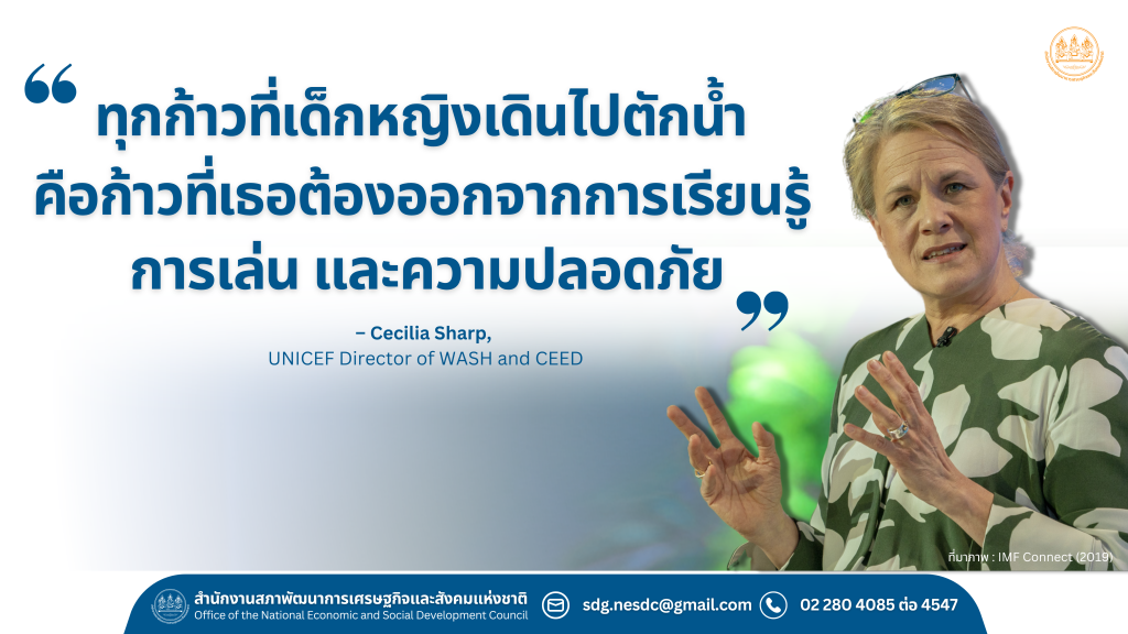 ายงานของ WHO และ UNICEF ระบุว่า ผู้หญิงและเด็กหญิง 7 ใน 10 ครัวเรือนที่ไม่มีน้ำประปาในบ้านเป็นผู้รับผิดชอบในการตักน้ำ ซึ่งมีแนวโน้มที่จะต้องใช้เวลาตักน้ำมากกว่าเด็กชาย และต้องเดินทางไกลกว่าด้วย ส่งผลกระทบโดยตรงต่อเวลาในการเรียนรู้ การเล่น และความปลอดภัย นอกจากนี้ในภาคการศึกษา เด็กหญิงจำนวนมากไม่สามารถไปโรงเรียนได้ในช่วงมีประจำเดือน เนื่องจากไม่มีห้องน้ำสะอาดหรือพื้นที่ซักผ้าที่เหมาะสมในโรงเรียน ซึ่งทำให้พวกเธอรู้สึกไม่ปลอดภัยและอับอาย ส่งผลกระทบต่อความมั่นใจและการเรียนรู้ระยะยาว