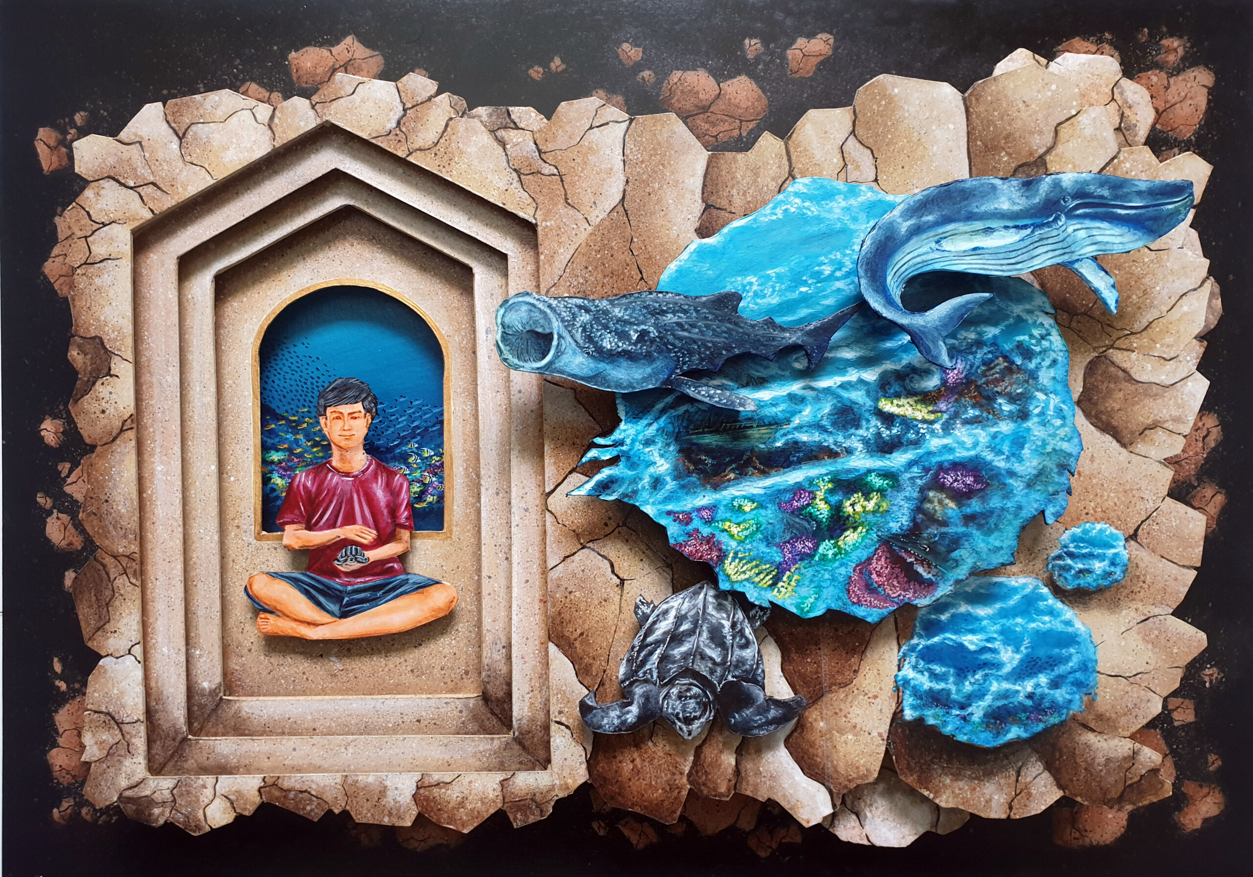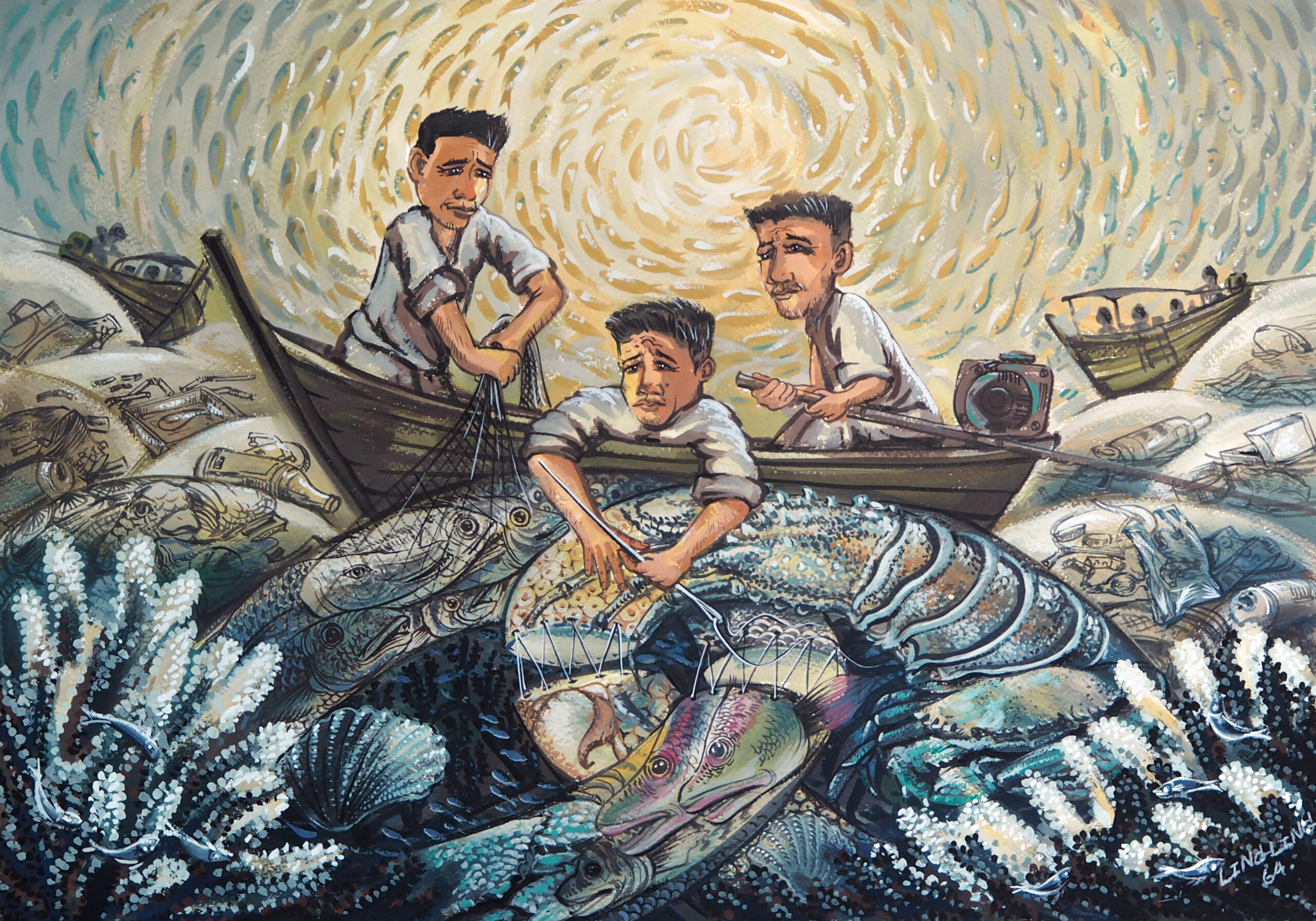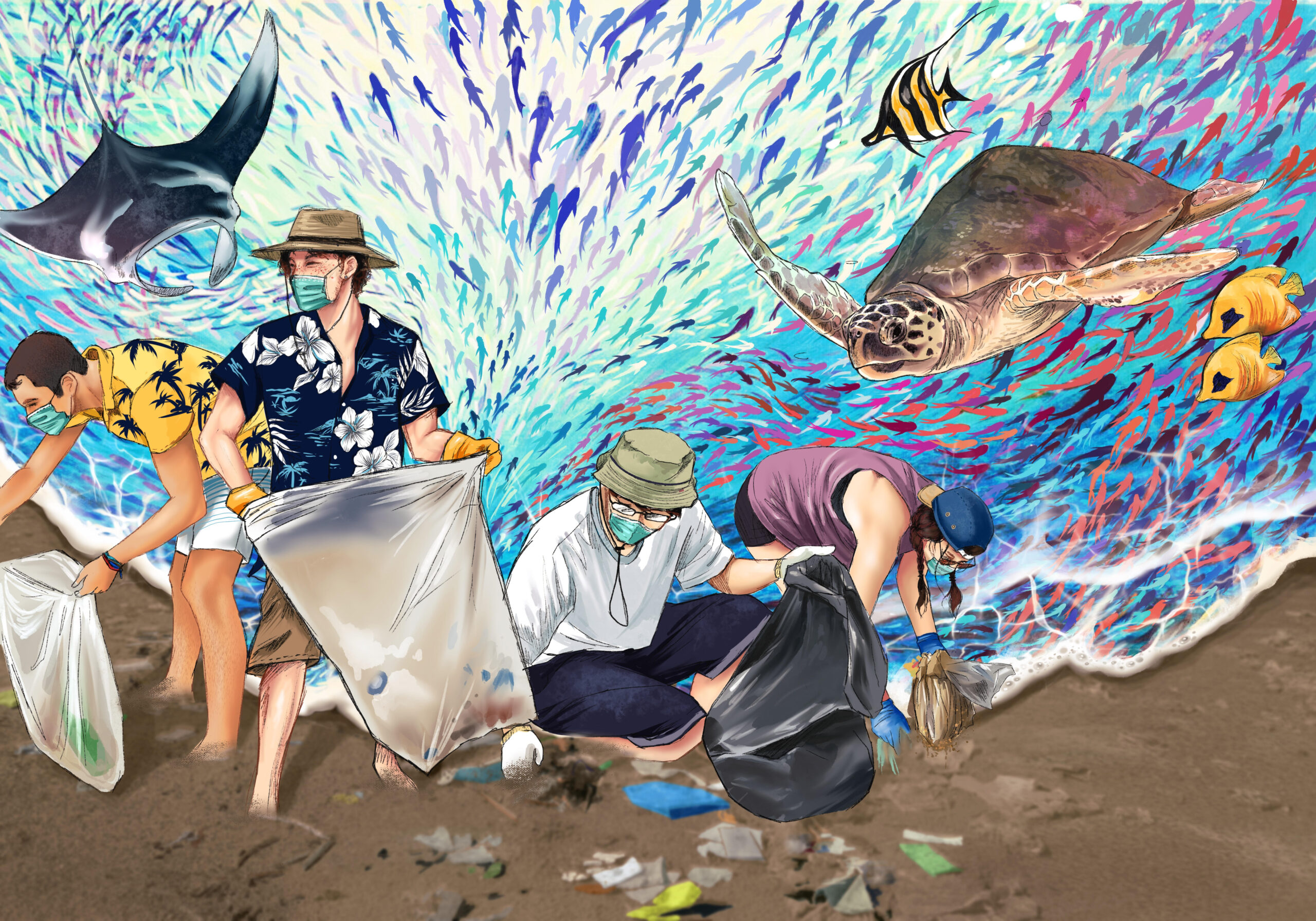 Concept: Currently, the ocean is being increasingly destroyed due to large amounts of waste being dumped into the ocean from the growing human population every day. The consequences of ocean destruction include the decline of marine life resources. Many living beings die or are injured because of waste that humans dump into the ocean. This image therefore conveys the problem occurring with ocean resources being destroyed by human waste, and groups of people helping to collect trash along the beach. Whether tourists or locals, they can all help together to restore the ocean’s condition and preserve marine resources.