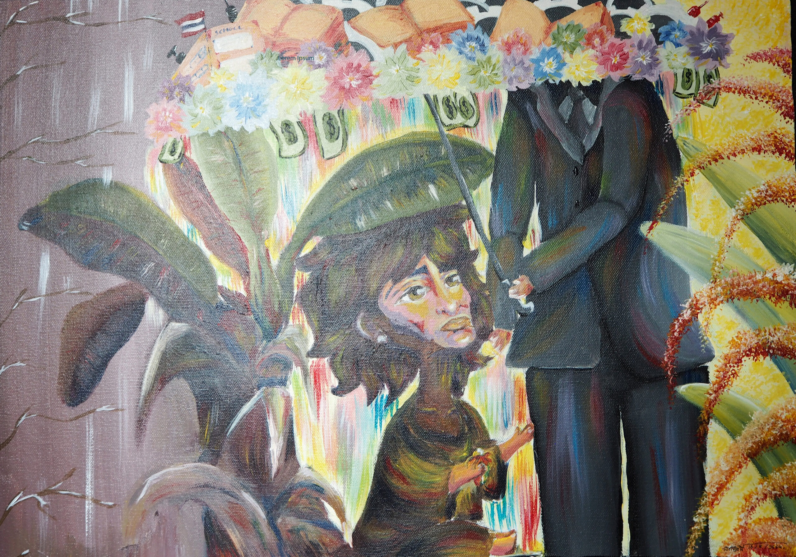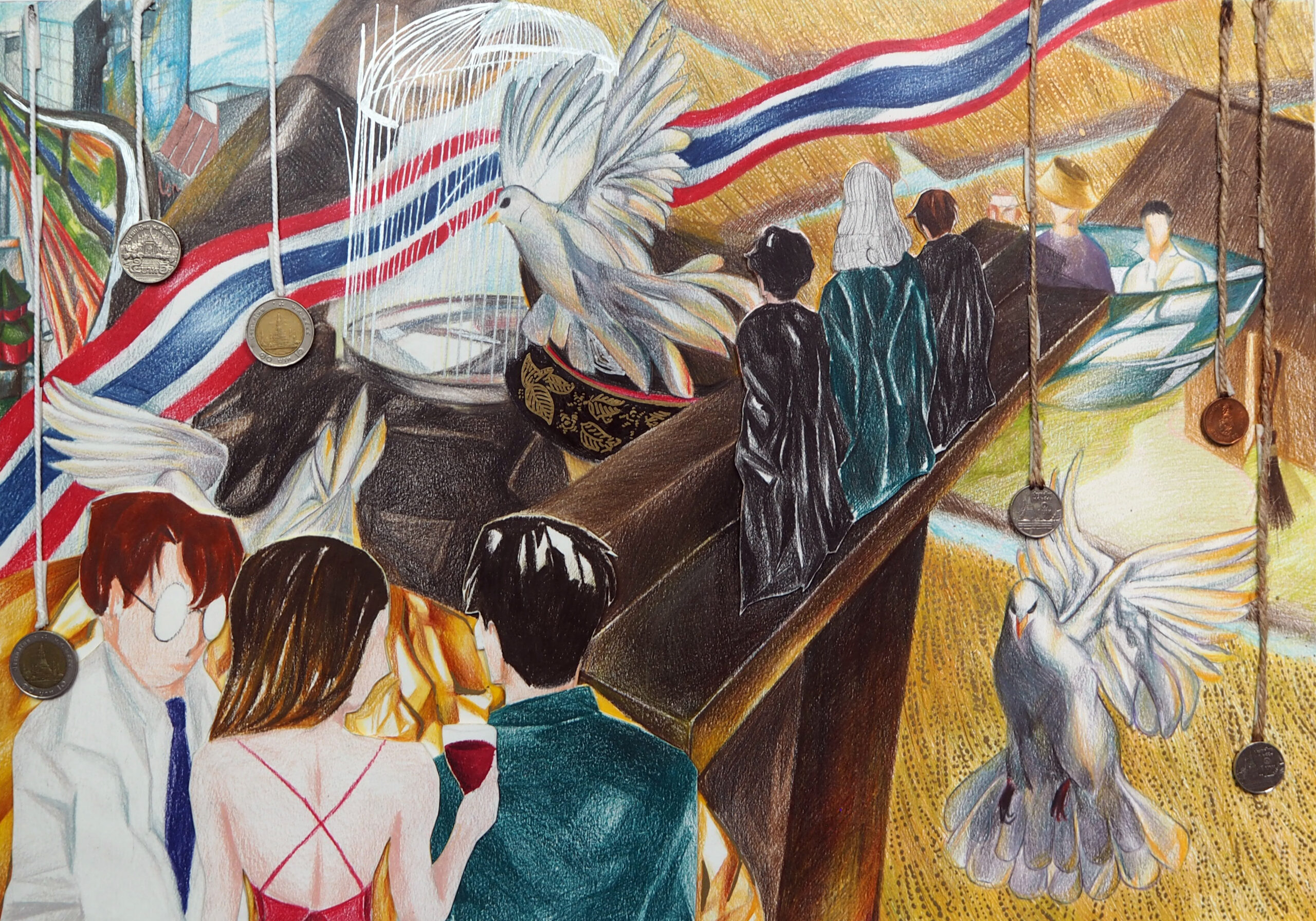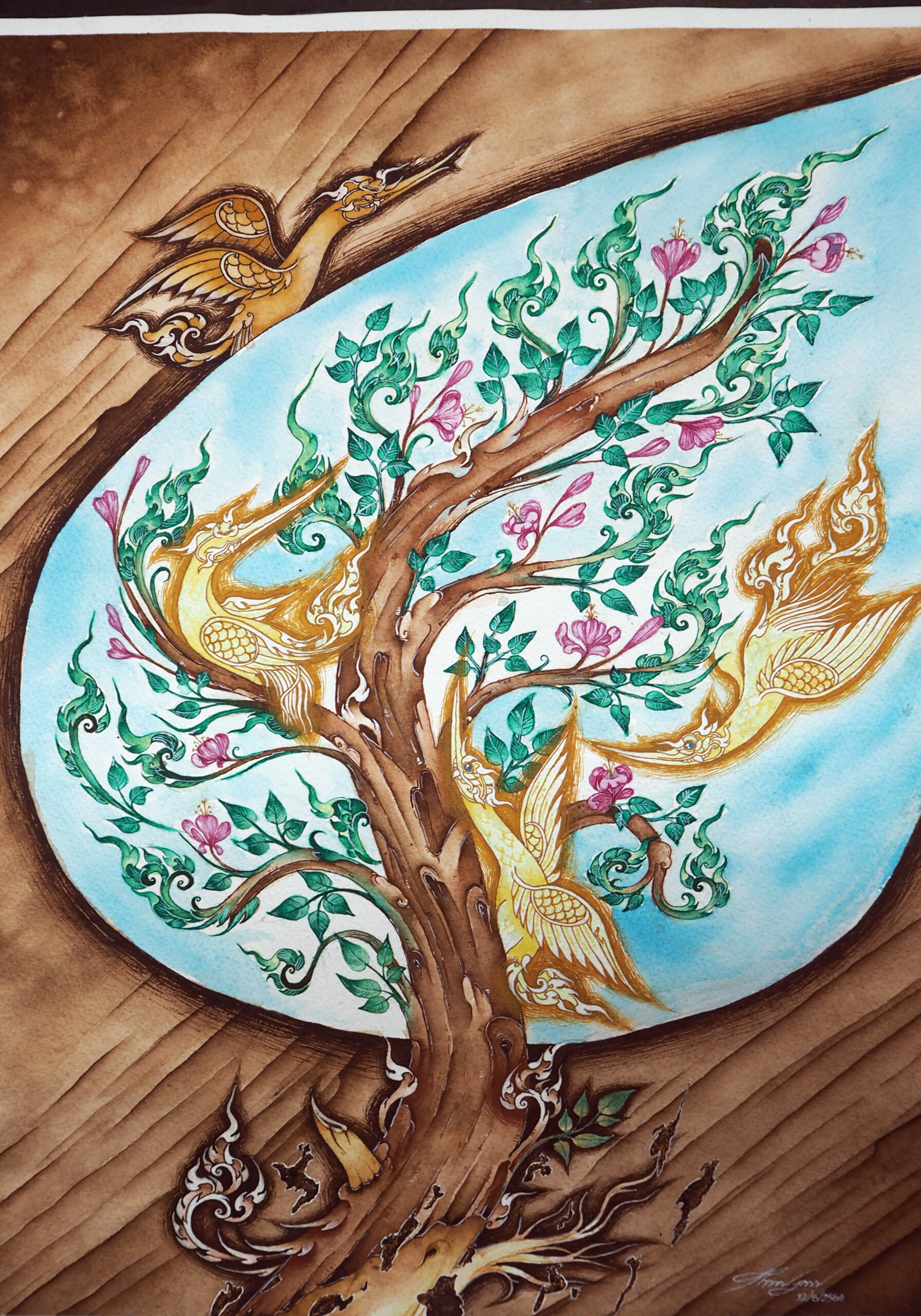 Concept: People and sustainable development. Comparing society to a tree, incorporating Thai patterns that I am skilled at. The center of the tree represents poverty and hunger, with the background as tree bark showing hardship and backwardness, but not giving up and continuing to grow. It may lean down sometimes but fights until it becomes a beautiful tree. The flowers represent gender equality, the swan represents freedom, while the swan outside shows not giving up against problems. If society has good well-being, the flowers will be beautiful.