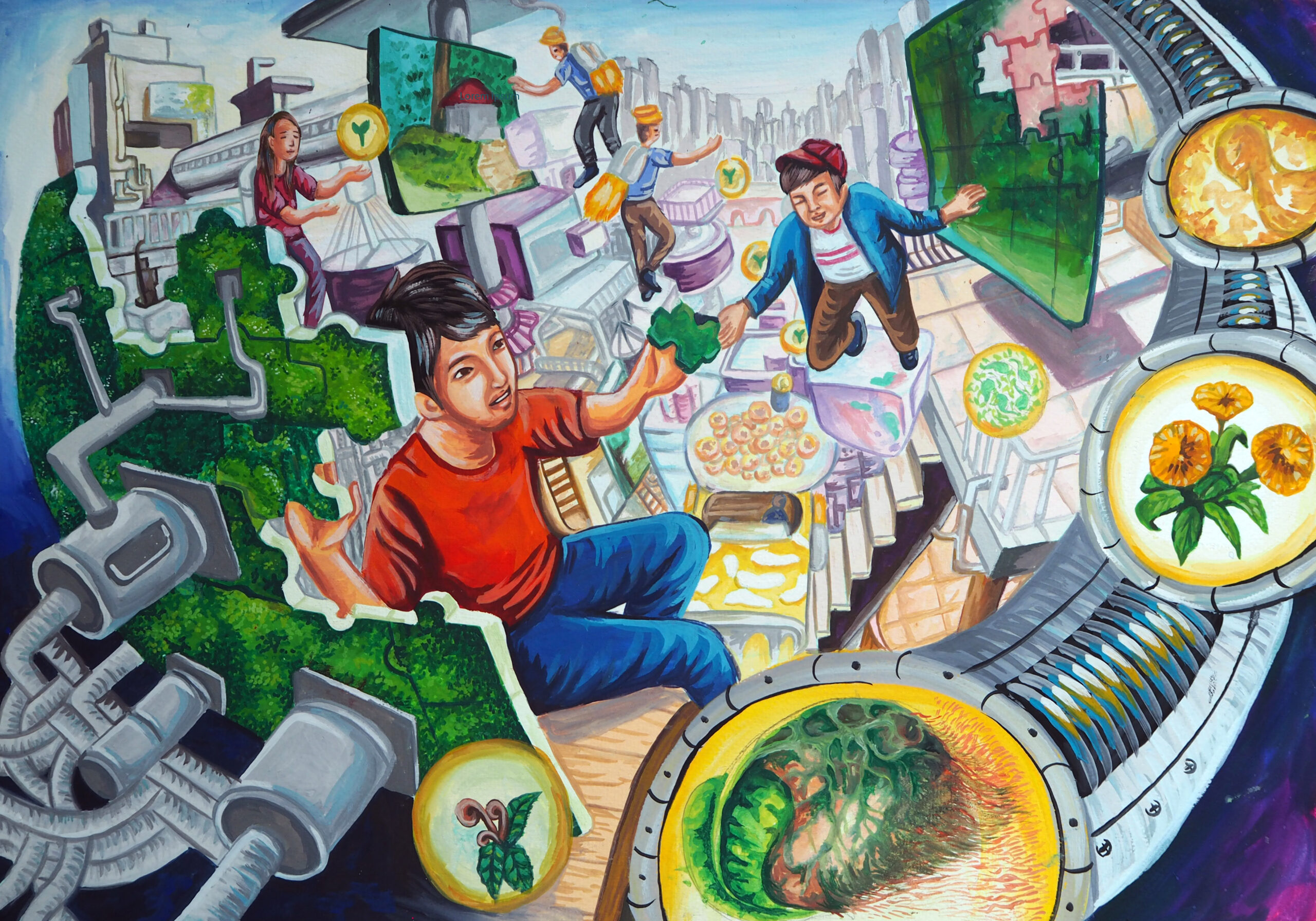 Concept: Technological advancement and new cutting-edge innovations of the future world that emerge so rapidly that we can barely keep up with the progress. However, at the same time, humans have extracted natural resources from this planet for use until they are nearly depleted. Therefore, there should be new production or compensation for living things from nature that have been lost.