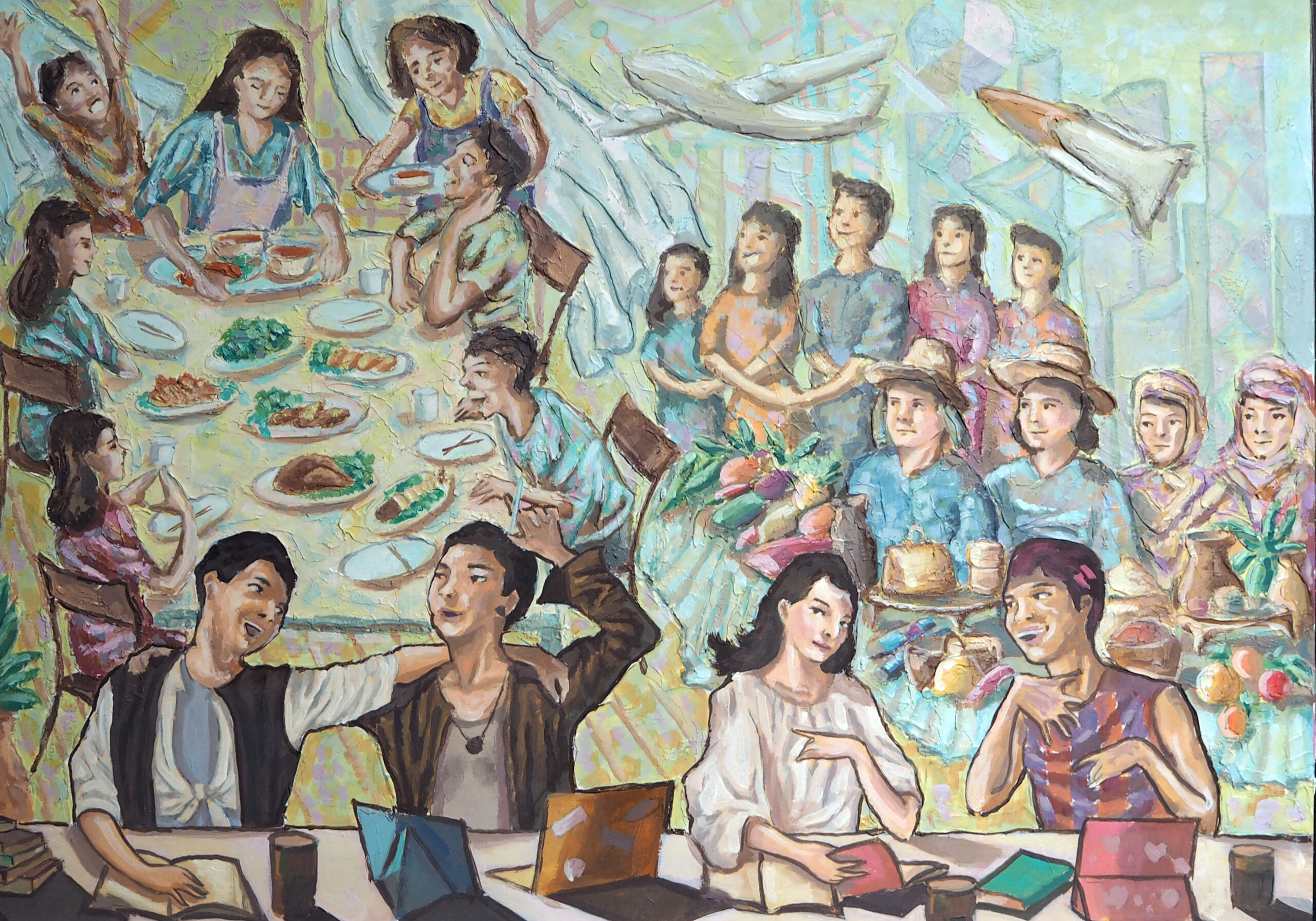 Concept: A group of students studying and expressing ideas about hunger problems. OTOP products by villagers generate income in the community and preserve old traditions from disappearing. Poverty problems. Business leaders guide economic prosperity and progress. People have enough to eat and use, with modern technology and good living conditions. Families dining together happily in a warm atmosphere with open conversations without discrimination of thought, representing gender equality.