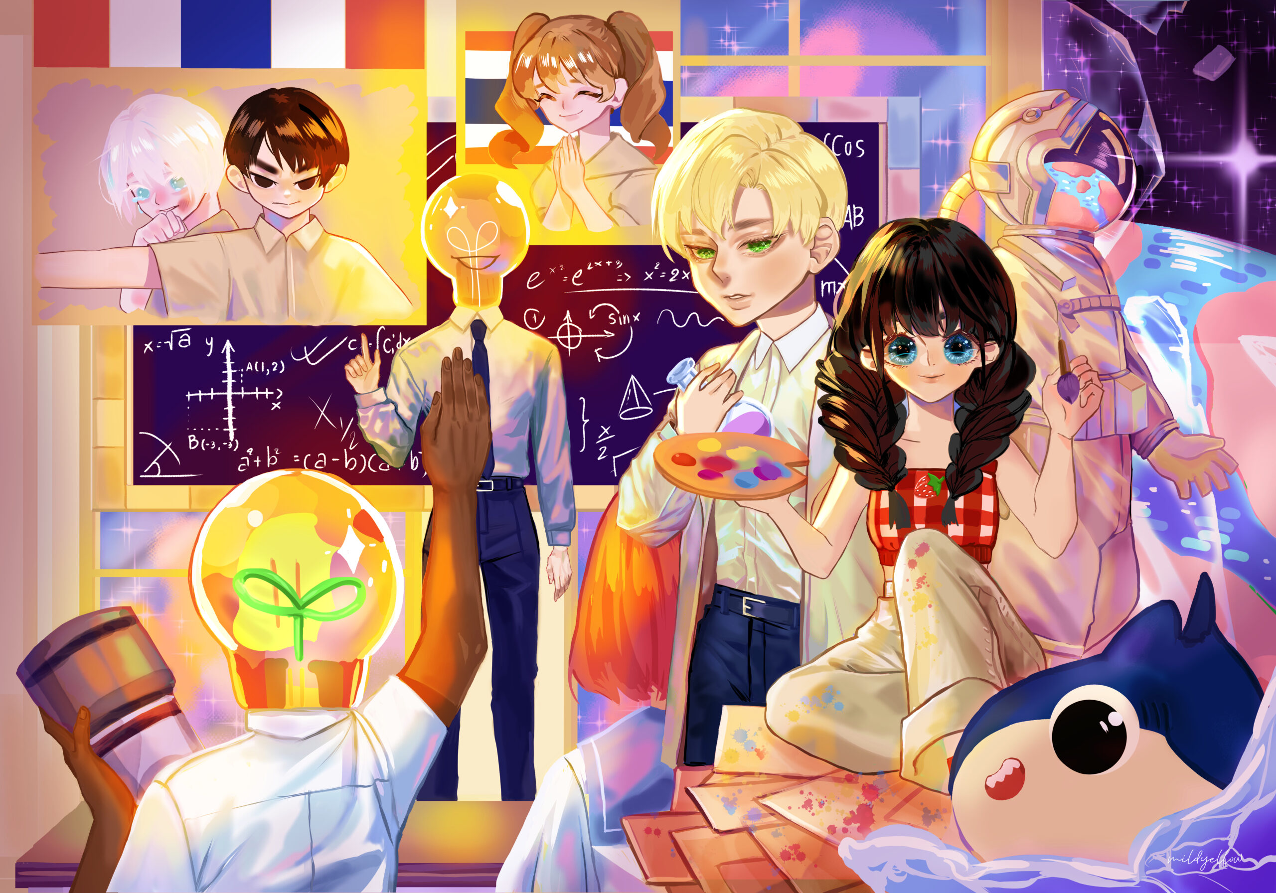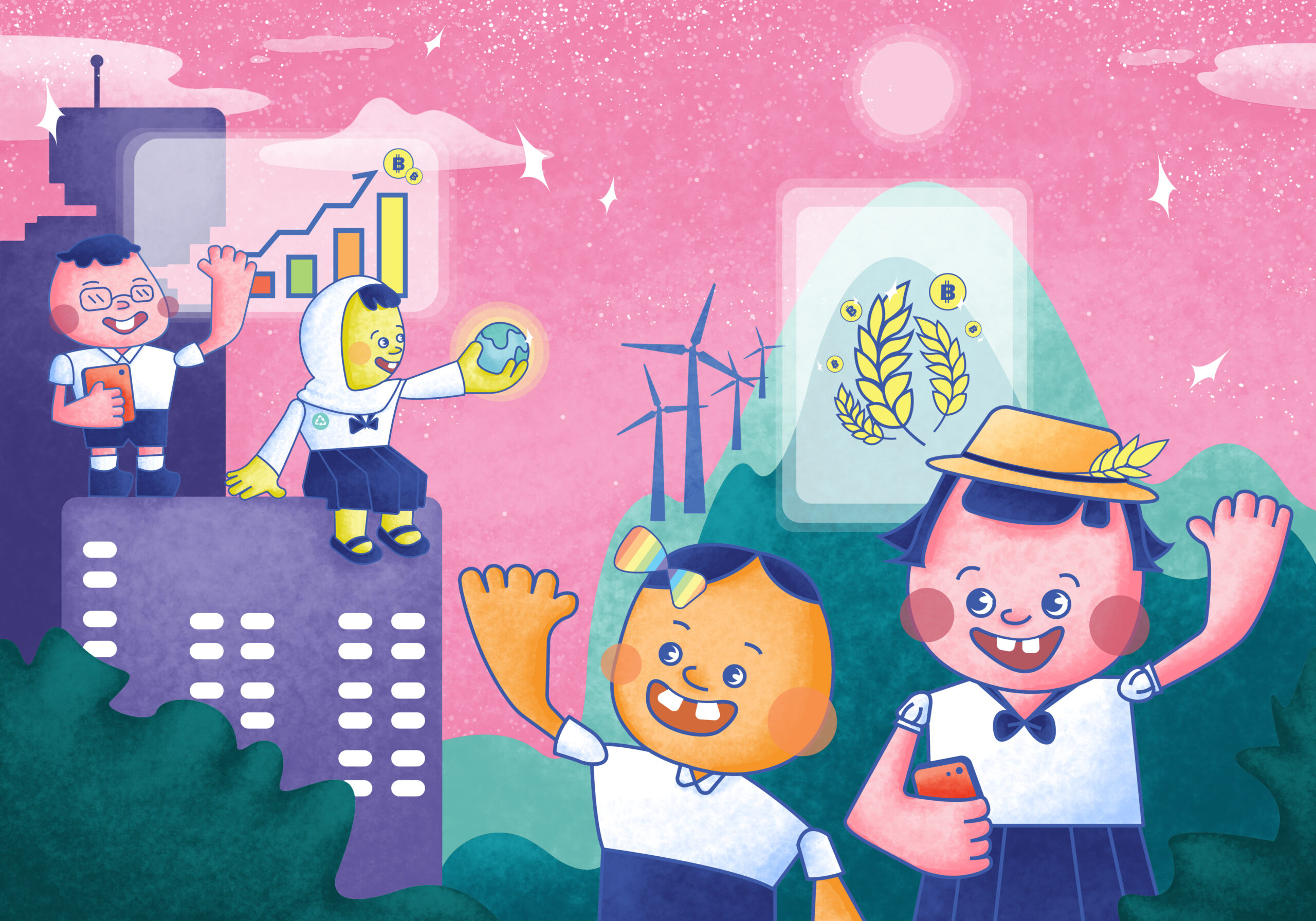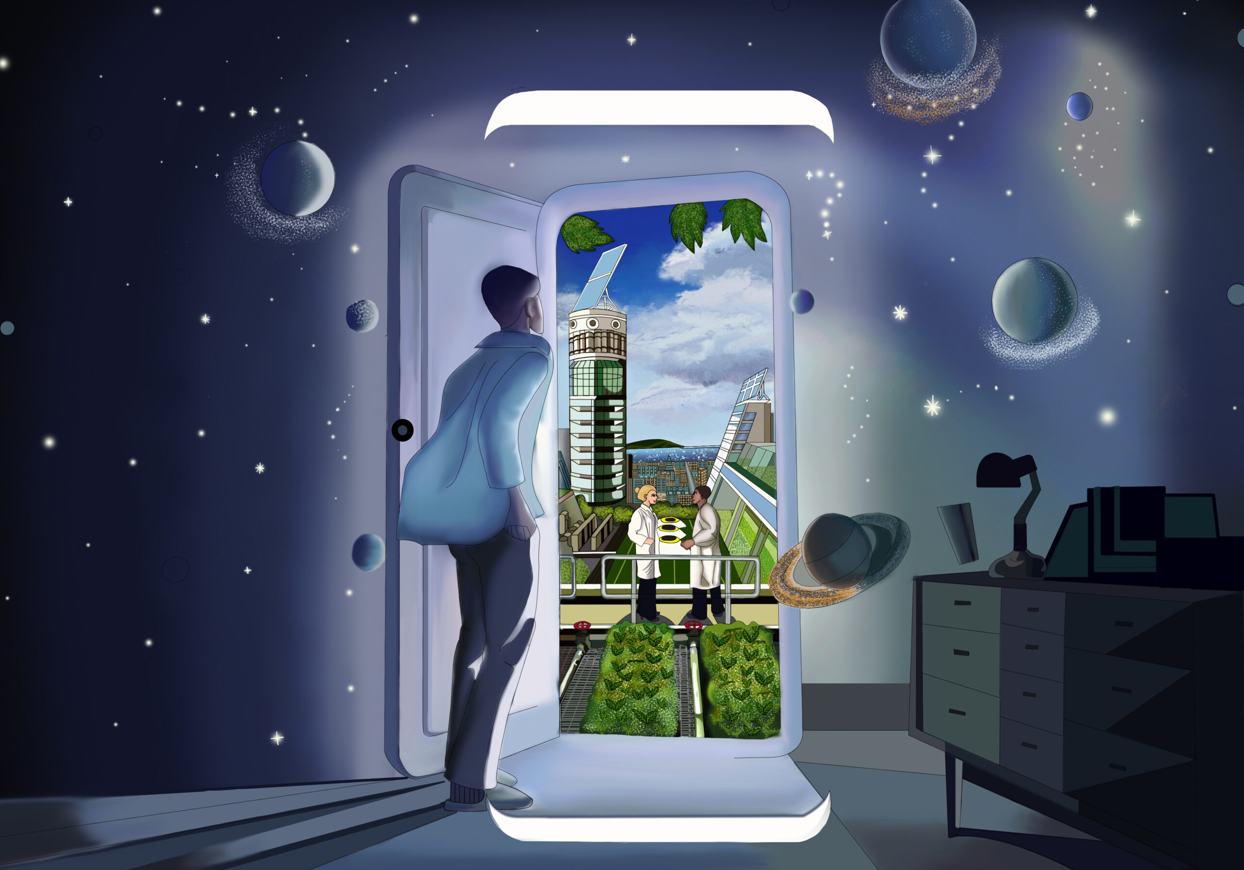 Concept: Economic Growth and Sustainable Development, Industry, Innovation and Infrastructure. Inspired by the Doraemon cartoon with magical items like the dimensional door that can travel to the future world, I conceived the idea of having a world inside the dimensional door showing two scientists standing and talking, along with sustainable environments such as trees, rivers, building construction, and development while maintaining and preserving the environment to coexist with humans. The person standing outside represents current people ready to develop forward, surrounded by galaxies to represent science and new innovations.