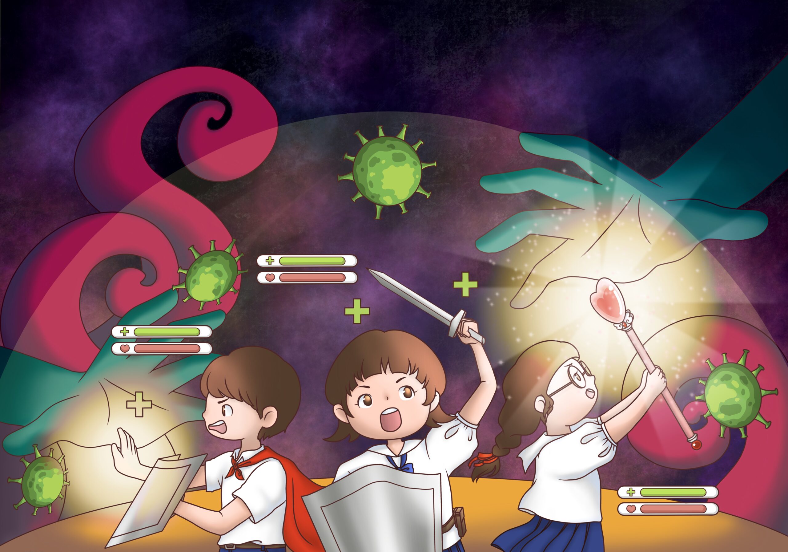Concept: Health and Well-being. This will reduce deaths of children and youth from various diseases, accidents, and pollution. The image is designed with a game character theme, featuring healing values and life force. In the image, children are drawn with barriers protecting them from various dangers. The children hold shields, swords, and staffs to fight against the dark threats outside the barrier.