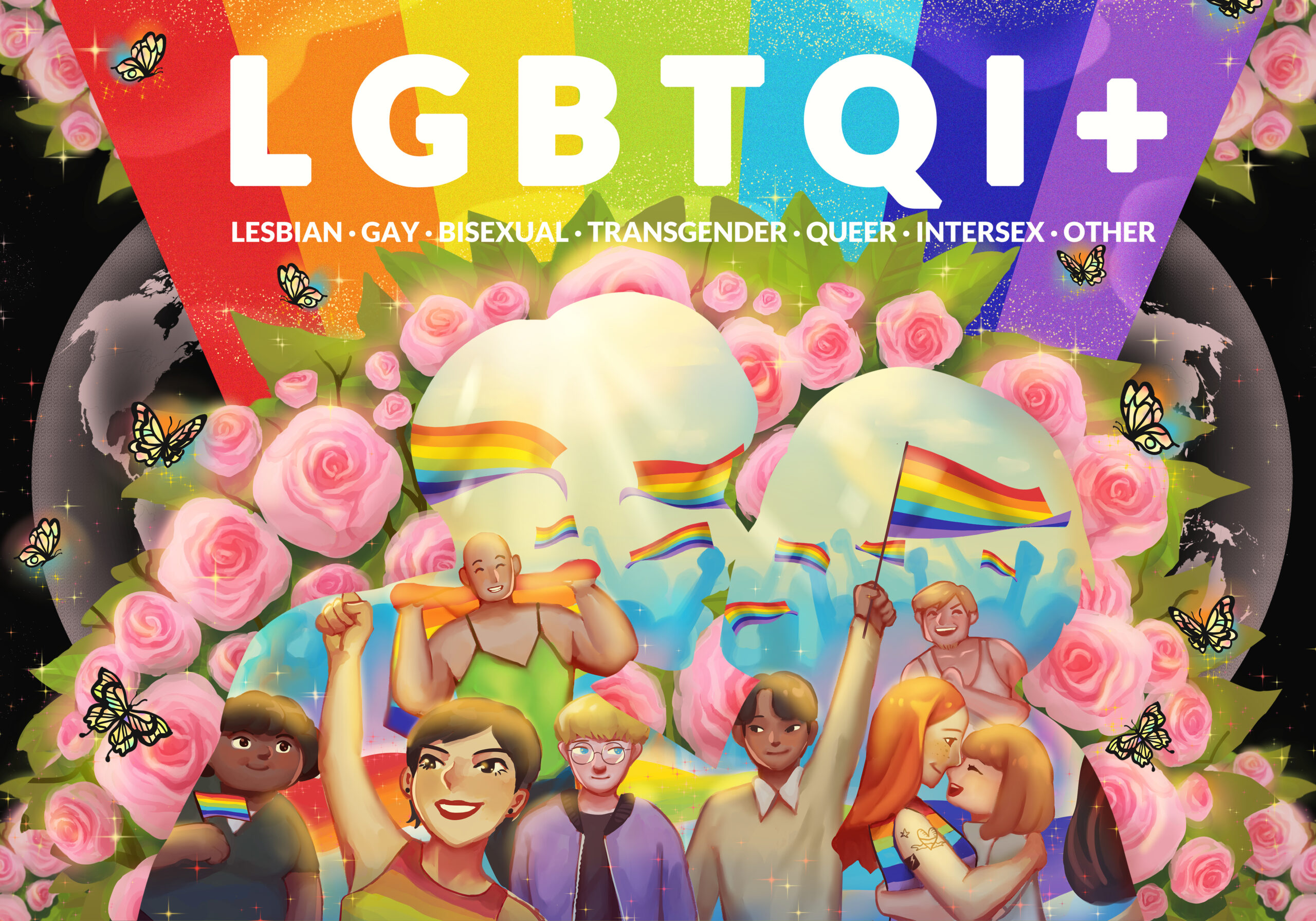 Concept: SDGs and Gender Equality. The silhouette of two men kissing represents one form of love expression, conveying the meaning of love without gender limitations. The shadow image shows a diverse group of people of various nationalities and appearances participating in a Pride Parade while waving rainbow flags, which are symbols of LGBTQI+. Behind them is a rose bush with rainbow butterflies perched on it. Roses are flowers that represent love. Having love regardless of gender is beautiful like flowers, and rainbow butterflies represent the LGBTQI+ community. The globe in the background conveys that gender diversity exists in many countries around the world.