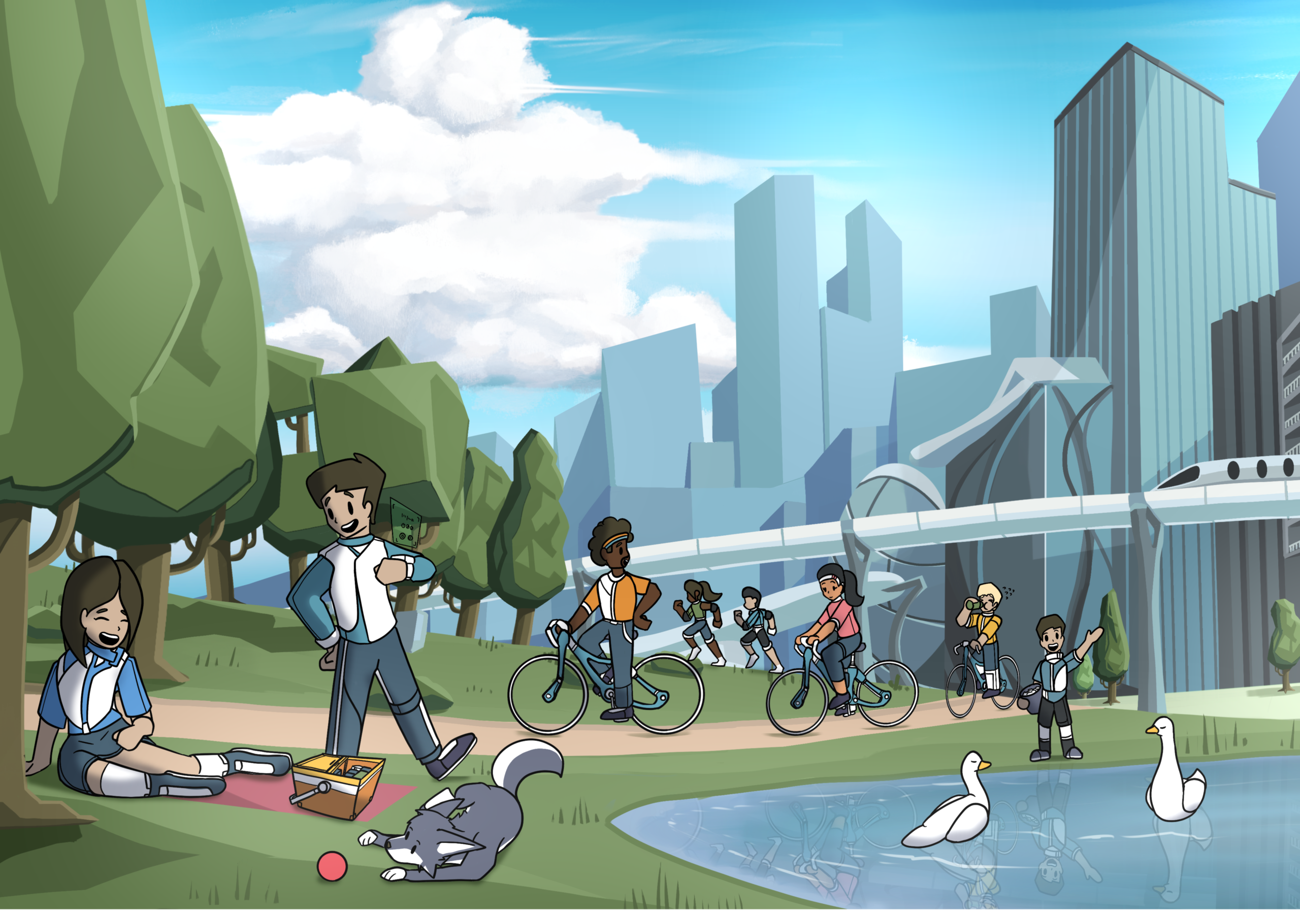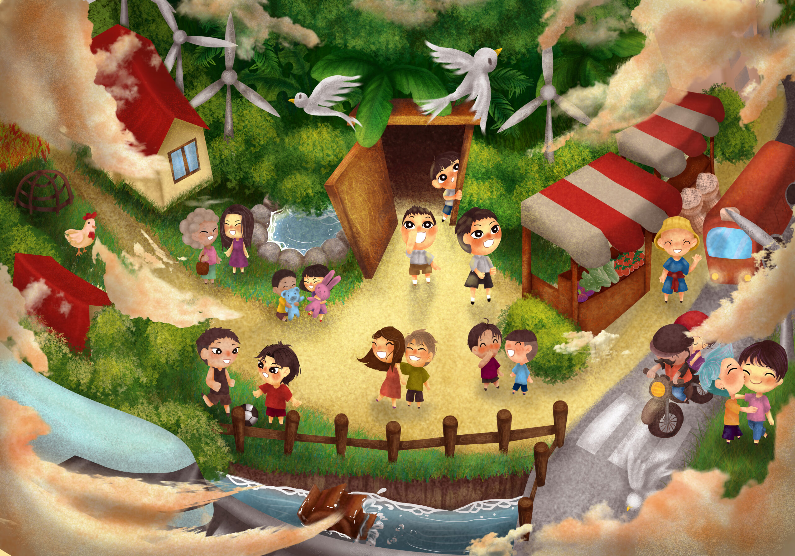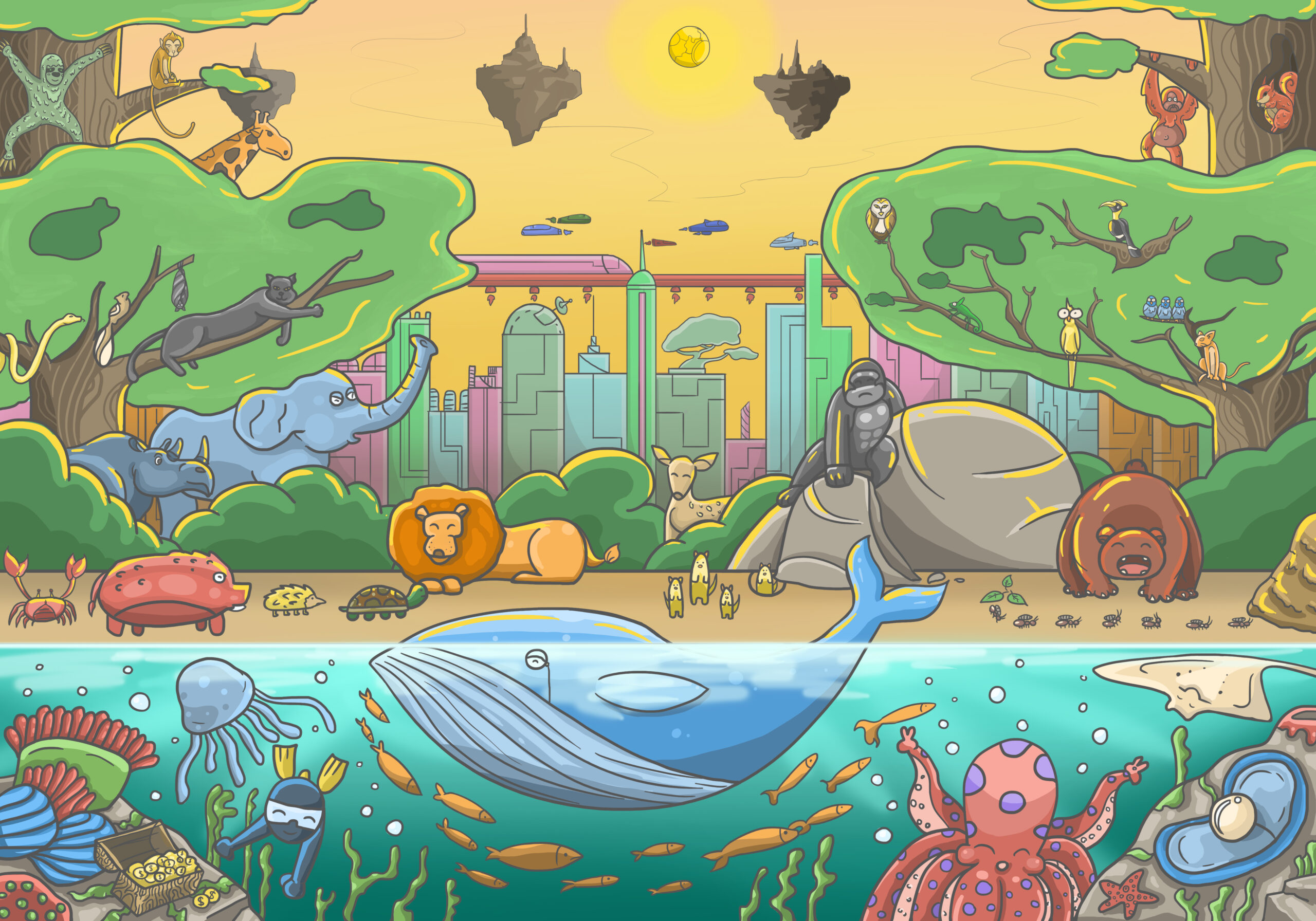 Concept: Environmental Protection and Sustainable Development (Planet). Emphasizing the protection and preservation of natural resources and climate for future generations. Environmental protection will keep everything complete and abundant, and we can coexist with nature. Therefore, I drew abundant forests with various animals living together, clear and clean water, clear skies, good air, and cities that are technologically advanced beyond the current world while coexisting with nature.
