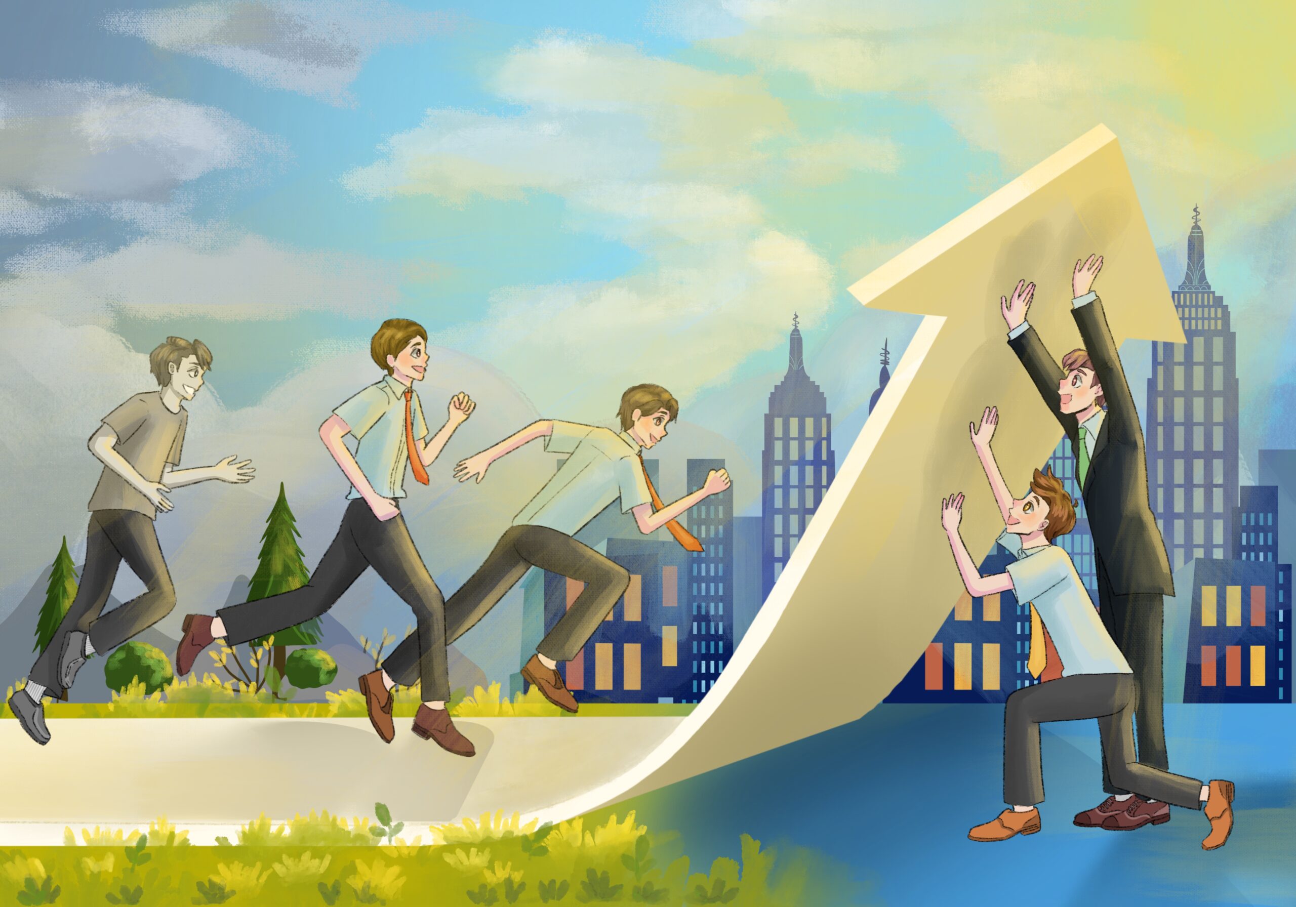Concept: Promoting Partnerships for Sustainable Development. This represents cooperation between developed and developing countries to assist least developed countries in achieving prosperity and greater access to various resources. The presentation uses the metaphor of a path as development, with people helping to carry the load, with the destination being an upward-pointing arrow. People in suits represent developed countries helping to carry the arrow with people in short sleeves and ties representing developing countries. The person running along the road wearing a black and white t-shirt represents least developed countries. The entire image has normal colors, but the side representing least developed countries is in black and white to convey backwardness and less happiness compared to developed countries.
