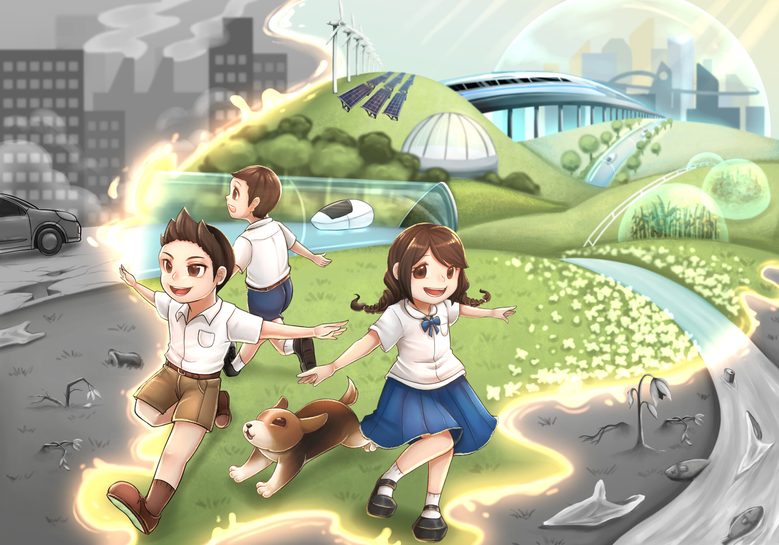 Concept: SDGs and Youth. The development of the country and environment by the next generation of children in the future. The image portrays a child running forward, symbolizing the new generation driving the development of the country toward modernity, cleanliness, and better environmental conditions. For coloring, the surrounding areas use black and white to represent the deteriorated urban conditions, while the areas where children walk use bright, vibrant colors with environments that look more modern and livable than before.